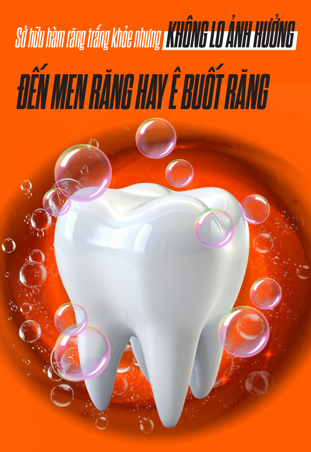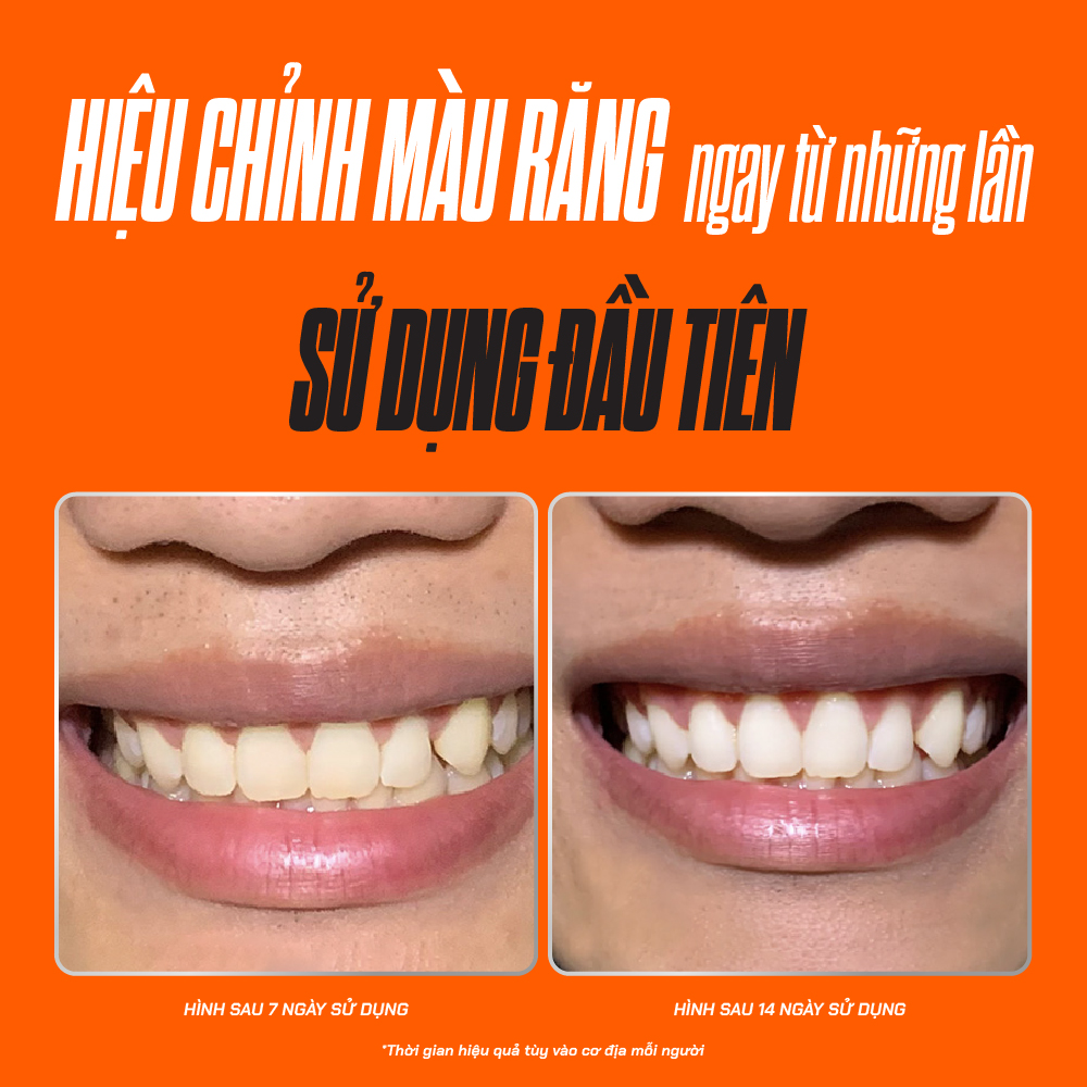Sử dụng công nghệ hiệu chỉnh màu răng => thay đổi màu răng chỉ sau 1 lần sử dụng (Màu tím khi thoa lên răng sẽ trung hòa các sắc tố vàng, tạo thành màu trắng)