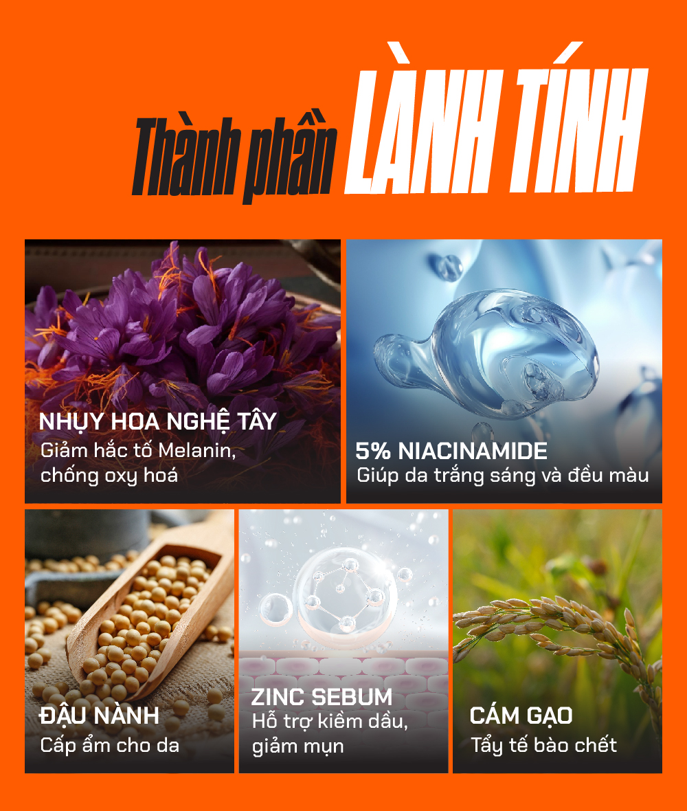 Water, Sodium Methyl Cocoyl Taurate, Glycerin, Cocamidopropyl Betaine, Allantoin, Coconut Diethanolamide, Coconut Oil, PEG 7 Glycerincocoate, PEG 40 Hydrogenated Caster oil, Sodium Lauryl Ether Sulfate, Niacinamide, Soybean Extract (Chiết xuất Đậu nành), Rice Bran Extract. (Chiết xuất Cám Gạo), Crocus Sativus Flower Extract (Chiết xuất Nhụy Hoa Nghệ Tây), Zinc Sebum, Phenoxyethanol.